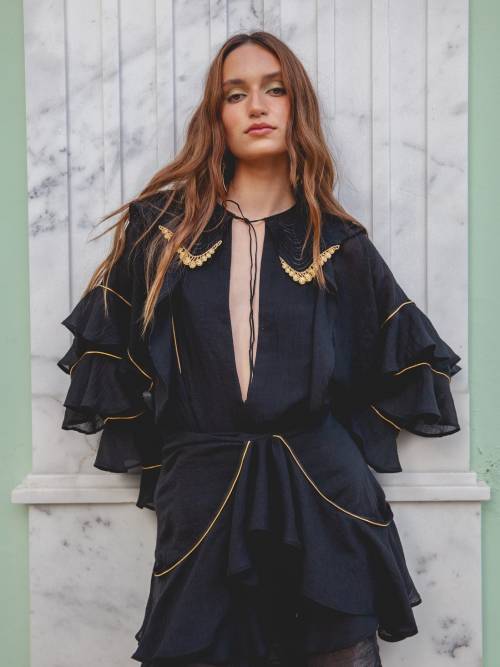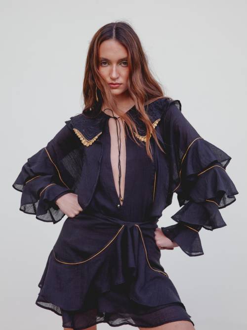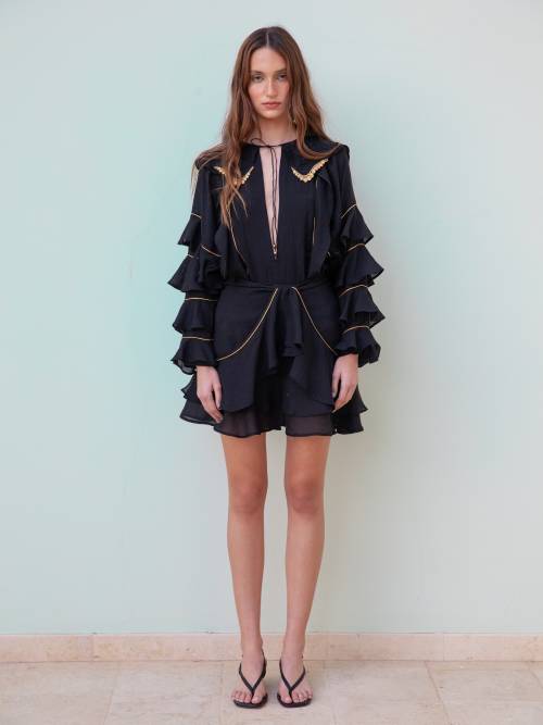 Midi dress with front waist ruffled yoke detail, low front v decollete ,raglan sleeves with elastic wrist, skirt sits fitted at hips open v back