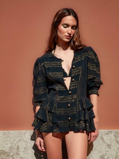 Long dress with ruffled hem detail and low back, straight loose fit, back ruffled cape