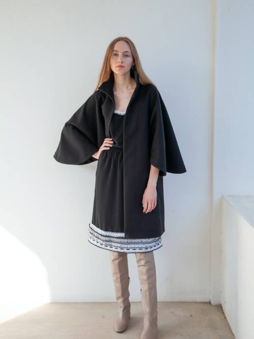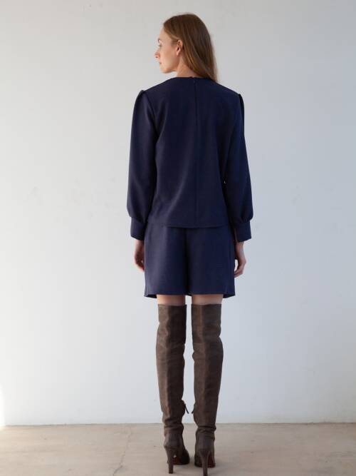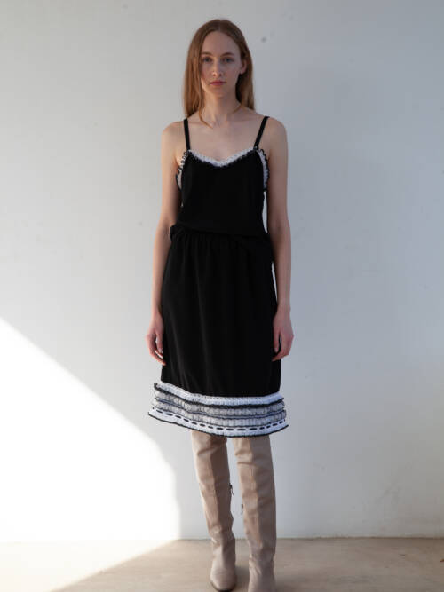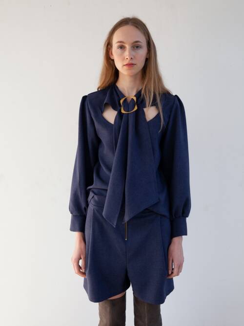 Cutout lace bodysuit with ruffle front detail and neck band, long fitted sleeves, ties at back neck