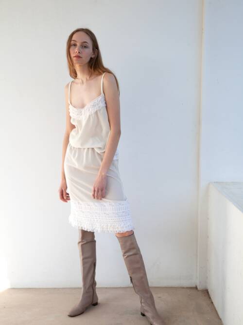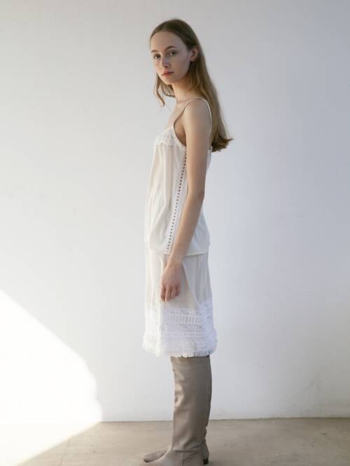 Lace ruffled trim front and back detail, front leg slit detail, spaghetti straps, loose silhouette, comes with the belt