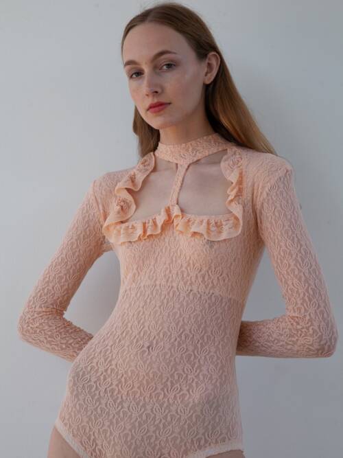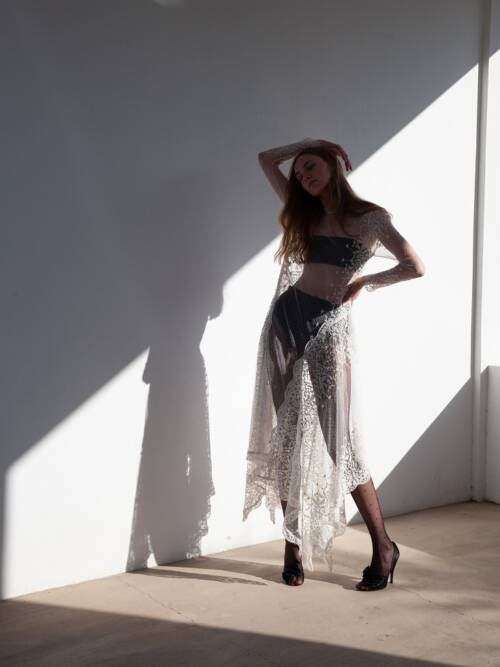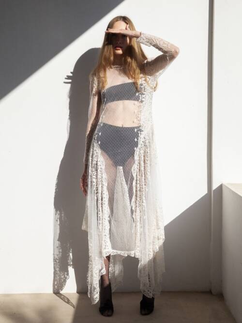 Lace dress with handkerchief style short sleeves, side full panel with ruffled trim detail, midi length