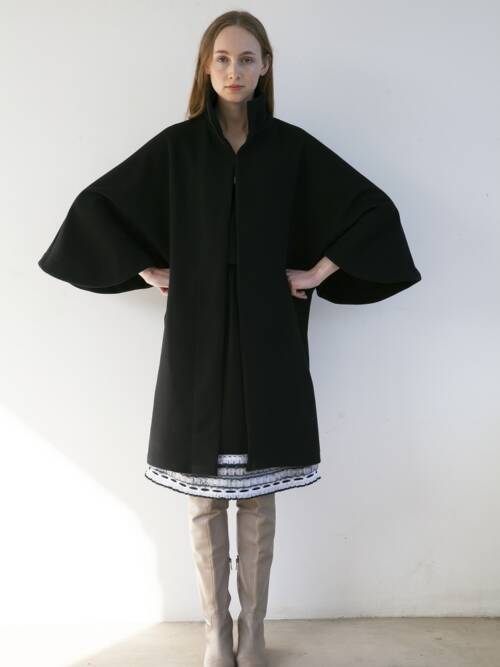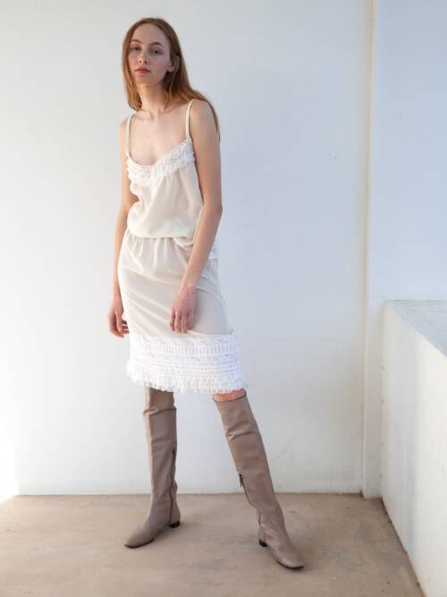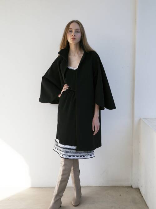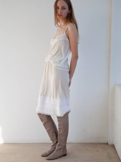 Lace dress with handkerchief style short sleeves, side full panel with ruffled trim detail, midi length