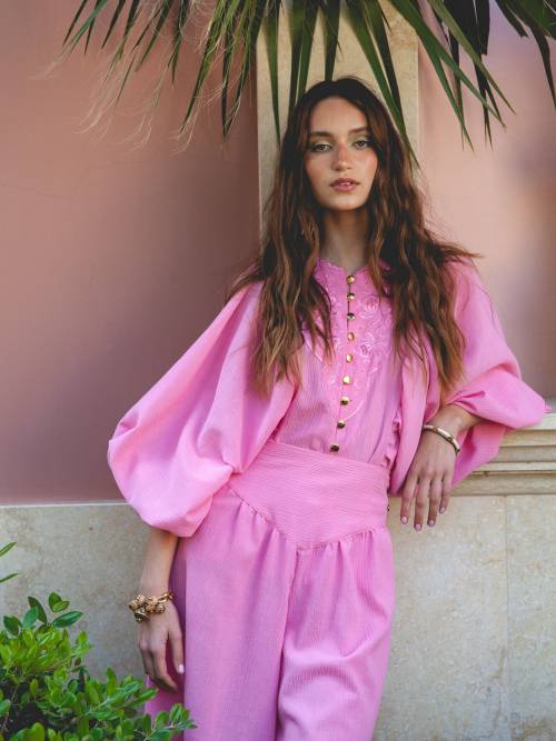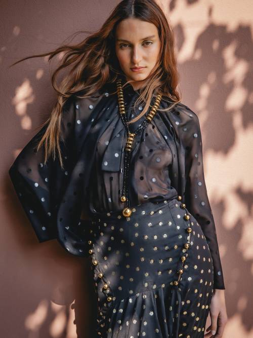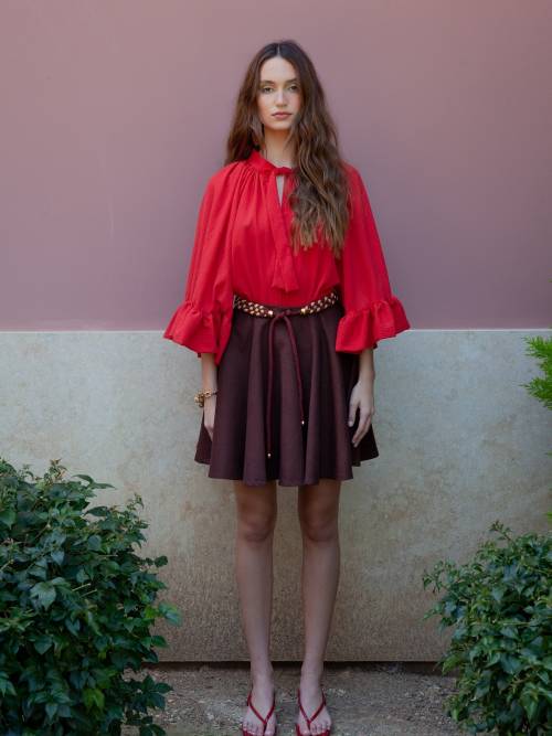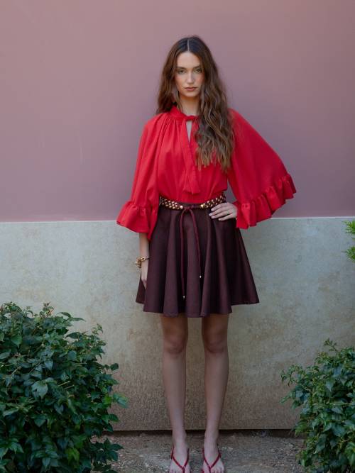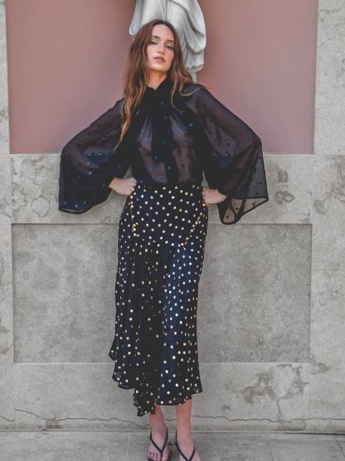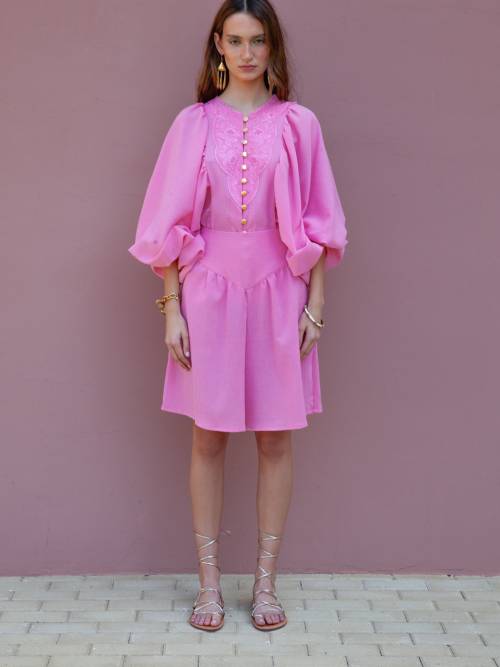 Midi dress with front waist ruffled yoke detail, low front v decollete ,raglan sleeves with elastic wrist, skirt sits fitted at hips open v back